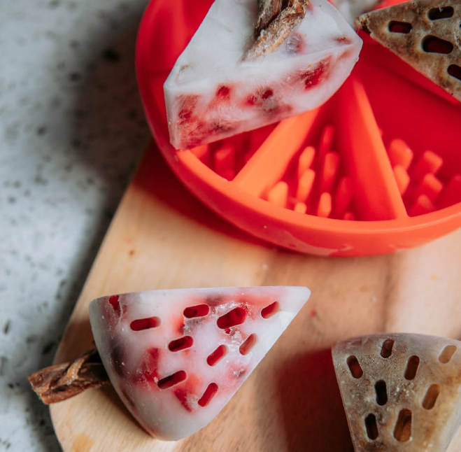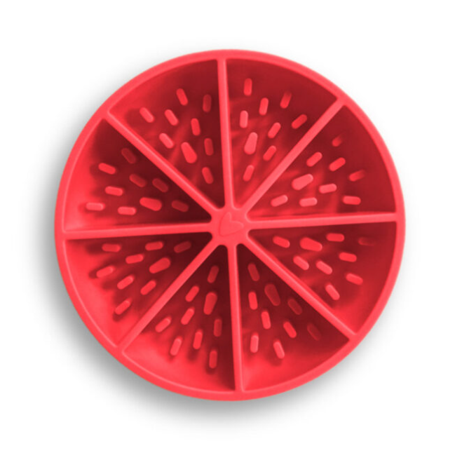 Un tapis de léchage se trouve au dos du bol. Il peut aussi servir pour faire des pupsicles.