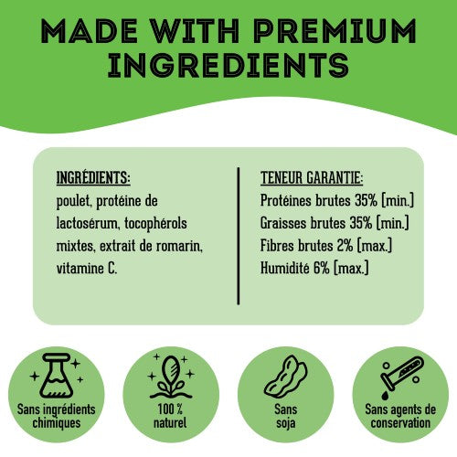 - ÇA, C’EST DU POULET! Qui n’aime pas le poulet? Levez la patte. C’est bien ce qu’on pensait. Les chiens (comme les chats) adorent sa saveur expressive et son goût de revenez-y.