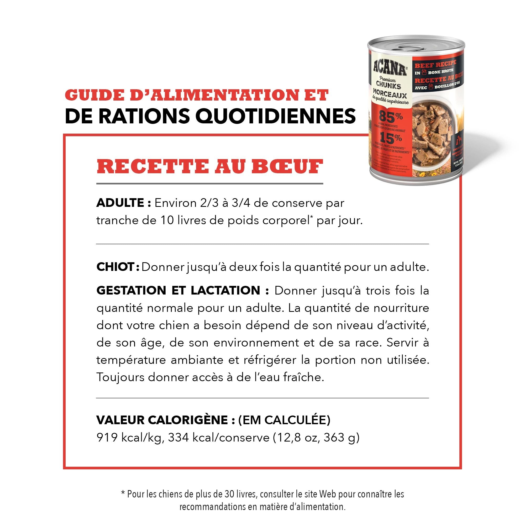 Ne vous arrêtez pas au premier ingrédient avec les recettes ACANAMD comme les Morceaux de qualité supérieure ACANA, confectionnés avec soin du début à la fin. Notre Recette au bœuf avec bouillon d’os est confectionnée avec 85%* d’ingrédients d’origine animale prenant la forme de morceaux de bœuf et d’agneau de qualité supérieure. Elle est équilibrée avec 15%*† de fruits et légumes visibles dans du bouillon d’os savoureux dont votre chien raffolera. Ajoutez-la sur les croquettes ACANA préférées de votre chien en guise de garniture humide avec un éclat de saveur, ou offrez-lui ce petit plaisir seul en guise de repas.