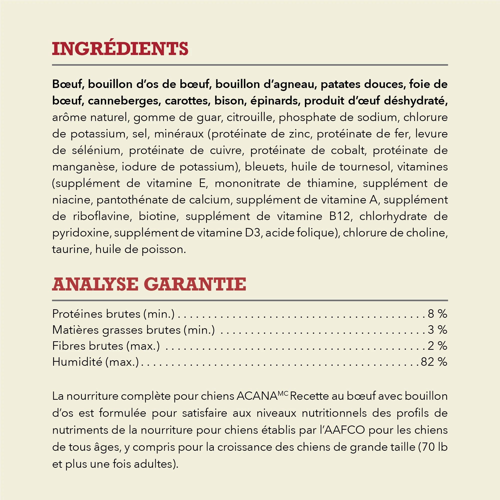 La nourriture Recette au bœuf avec bouillon d’os pour chiens ACANA est formulée pour satisfaire aux niveaux nutritionnels établis par l’AAFCO dans le profil des nutriments de la nourriture pour toutes les étapes du cycle de vie des chiens, y compris la croissance des chiens de grande taille (70 lb ou plus à l’âge adulte).