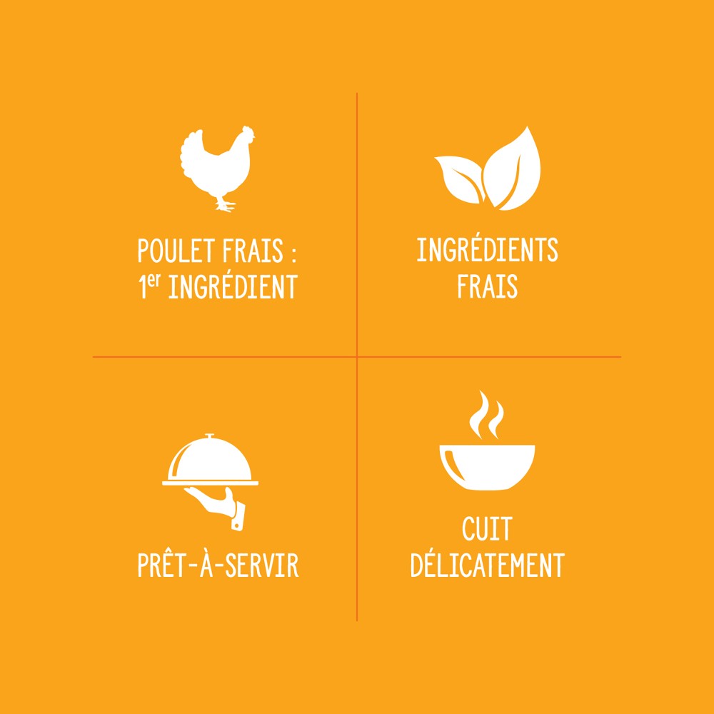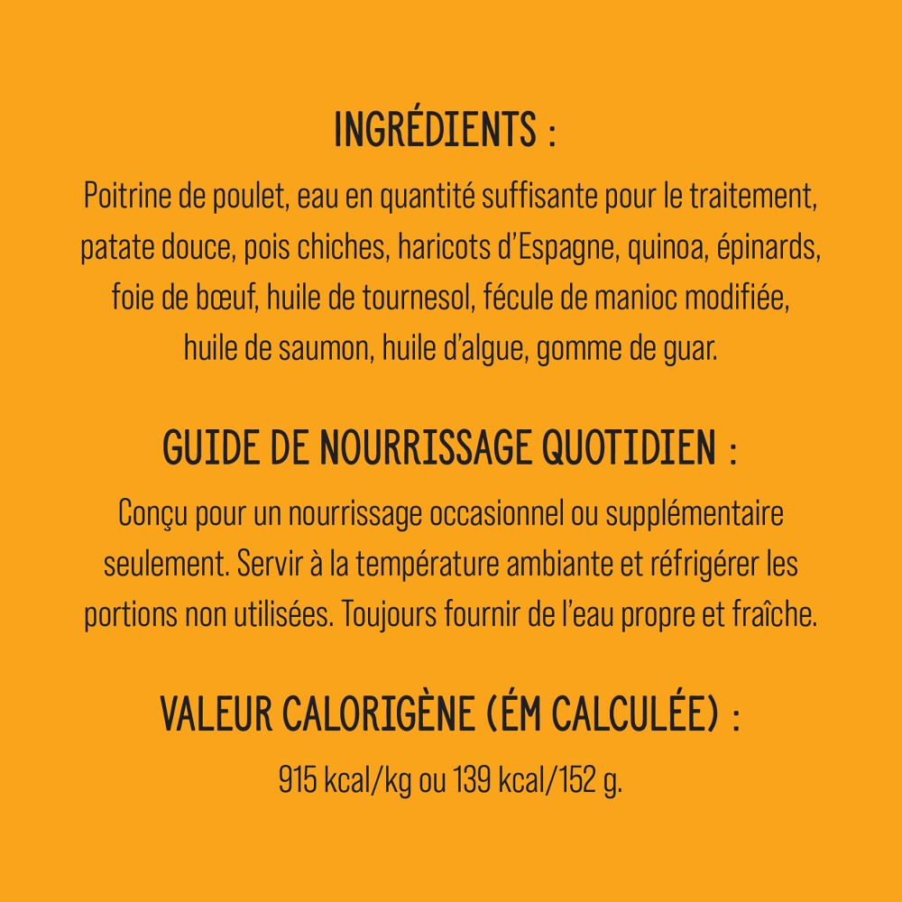 Poitrine de poulet, eau en quantité suffisante pour le traitement, patate douce, pois chiches, haricots d’Espagne, quinoa, épinards, foie de bœuf, huile de tournesol, fécule de manioc modifiée, huile de saumon, huile d’algue, gomme de guar.