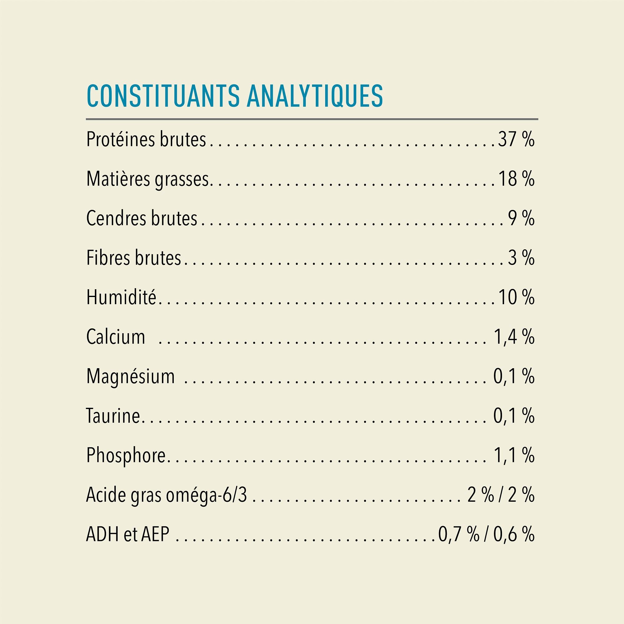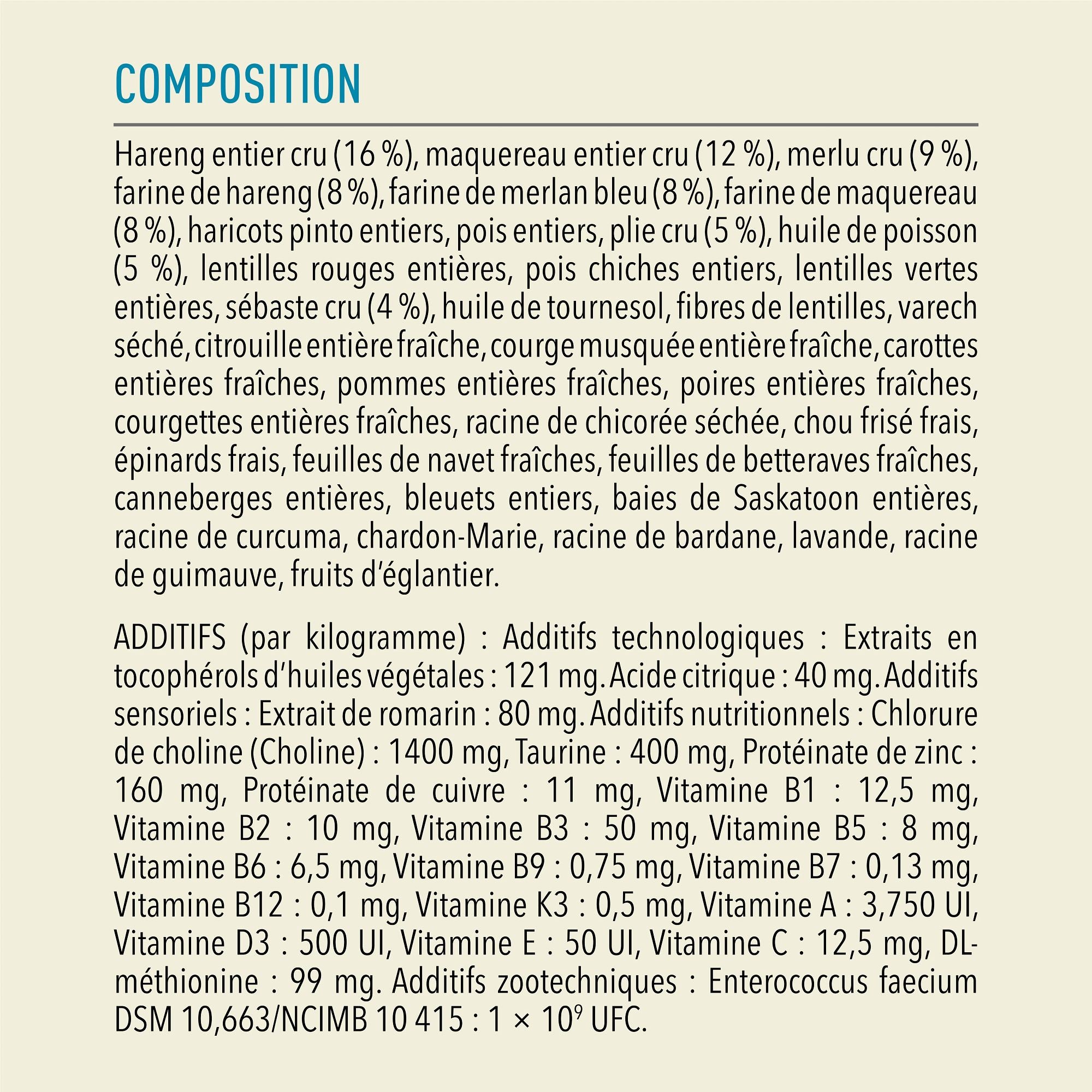 Hareng cru entier du Pacifique (14%), Maquereau cru entier du Pacifique (13%), merlu entier cru (9%), hareng déshydraté (8%), merlan bleu déshydraté (8%), maquereau déshydraté (8%), haricots Pinto entiers, pois entiers, Flet cru sauvage (5%), huile de goberge (5%), lentilles rouges entières, pois chiches entiers, lentilles vertes entières, sébaste entier cru (4%), huile de tournesol, fibres de lentilles, foie de morue lyophilisé (1%), varech séché, citrouille entière fraîche, courge musquée entière fraîche, chou frisé frais, épinards frais, feuilles de navet fraîches, carottes fraîches, pommes fraîches, poires fraîches, canneberges entièresfraîches, myrtilles entières fraîches (bleuets), racine de chicorée, racine de curcuma, chardon marie, racine de bardane, lavande, racine de guimauve, fruits de l’églantier. ADDITIFS (par kg) : Additifs technologiques: Avec antioxydants naturels. Additifs nutritionnels: Chlorure de choline:1200 mg, Taurine: 400 mg, Zinc (Chélate de zinc d’acides aminés, hydraté): 150 mg, Vitamine B1: 12.5 mg, Vitamine B2: 6 mg, Niacine: 50 mg, Vitamine B5: 8 mg, Vitamine B6: 6.5 mg, Acide folique: 0.75 mg, Biotine: 0.125 mg, Vitamine B12: 0.10 mg, Vitamine A: 3750 IU, Vitamine E: 230 IU, Vitamine K1: 0.5 mg, Cuivre (Chélate de cuivre (II) d’acides aminés, hydraté): 11mg, DL-methionine: 99 mg. Additifs zootechniques: Enterococcus faecium NCIMB10415: 600x10^6CFU