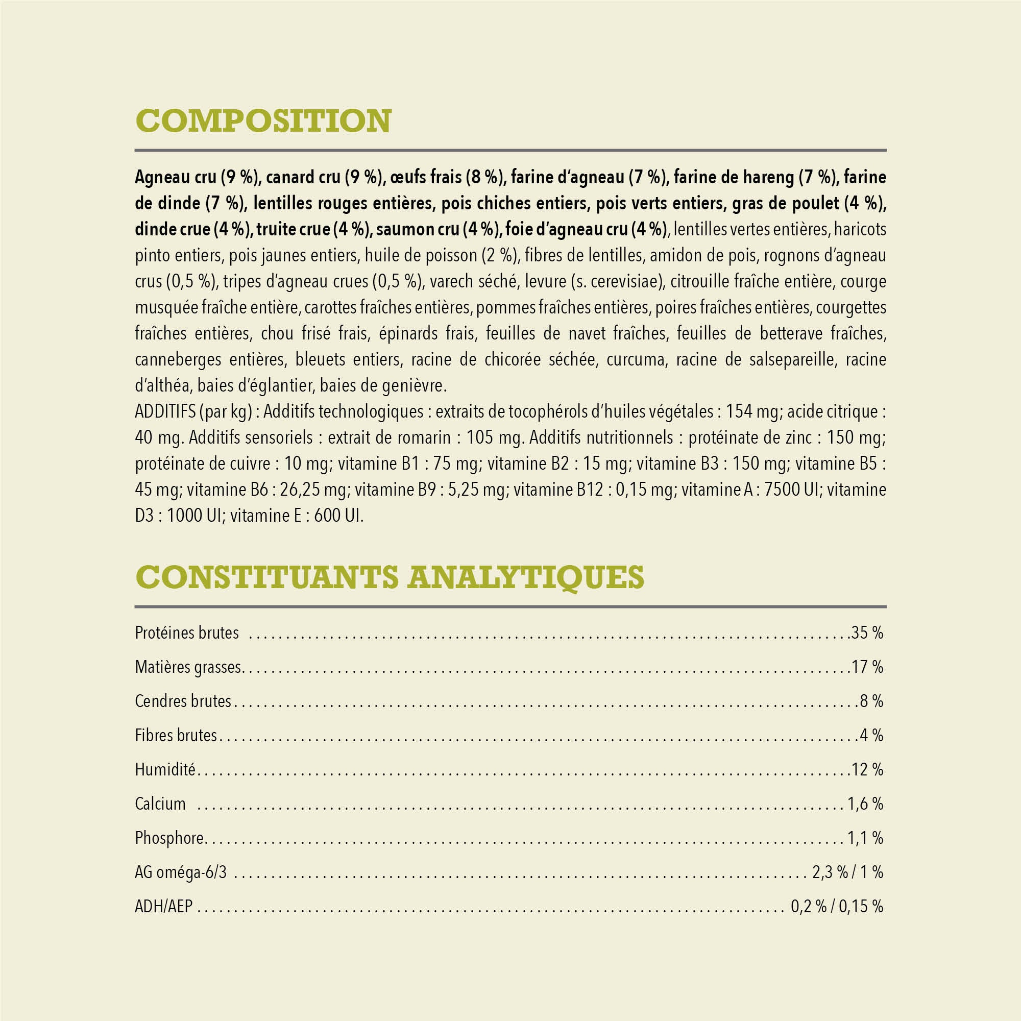 Agneau cru (9 %), canard cru (9 %), œufs frais (8 %), farine d’agneau (7 %), farine de hareng (7 %), farine de dinde (7 %), lentilles rouges entières, pois chiches entiers, pois verts entiers, gras de poulet (4 %), dinde crue (4 %), truite crue (4 %), saumon cru (4 %), foie d’agneau cru (4 %), lentilles vertes entières, haricots pinto entiers, pois jaunes entiers, huile de poisson (2 %), fibres de lentilles, amidon de pois, rognons d’agneau crus (0,5 %), tripes d’agneau crues (0,5 %), varech séché, levure (s. cerevisiae), citrouille fraîche entière, courge musquée fraîche entière, carottes fraîches entières, pommes fraîches entières, poires fraîches entières, courgettes fraîches entières, chou frisé frais, épinards frais, feuilles de navet fraîches, feuilles de betterave fraîches, canneberges entières, bleuets entiers, racine de chicorée séchée, curcuma, racine de salsepareille, racine d’althéa, baies d’églantier, baies de genièvre.