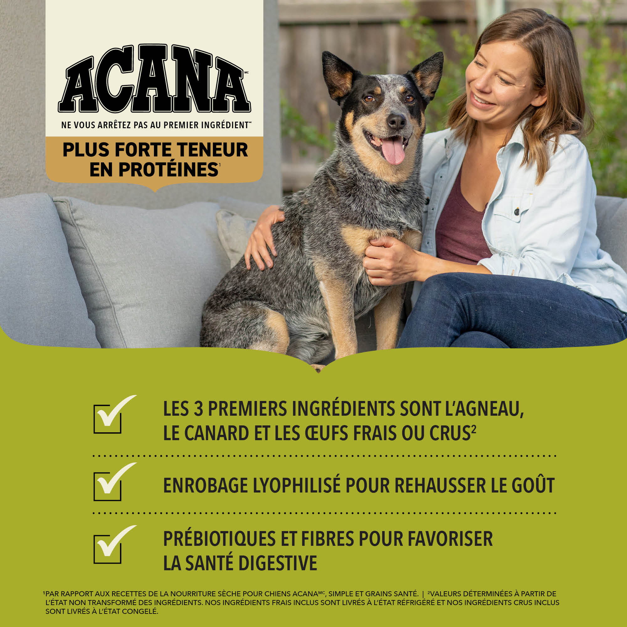Lorsqu’il est question des mélanges ACANAMD, nous sommes résolus à choisir des ingrédients nutritifs, délicieux et riches en protéines. Notre nourriture pour chiens Plus forte teneur en protéines est parfaite pour satisfaire votre chien grâce à la quantité accrue de protéines d’origine animale que les chiens adorent. Notre mélange Pâturages est composé à 70 % d’ingrédients d’origine animale1 comme de l’agneau et du canard élevés en liberté, et des œufs et à 30 %2 de fruits et de légumes pour fournir à votre chien différentes saveurs et protéines animales. Elle contient également des prébiotiques et des fibres pour aider à maintenir la santé digestive de votre chien. Comme elle ne contient ni colorants, ni arômes, ni agents de conservation ajoutés, votre chien et vous l’adorerez. Prenez soin de votre chien en lui offrant de la nourriture riche en protéines, nutritive et délicieuse pour l’aider à vivre une vie heureuse et en santé.