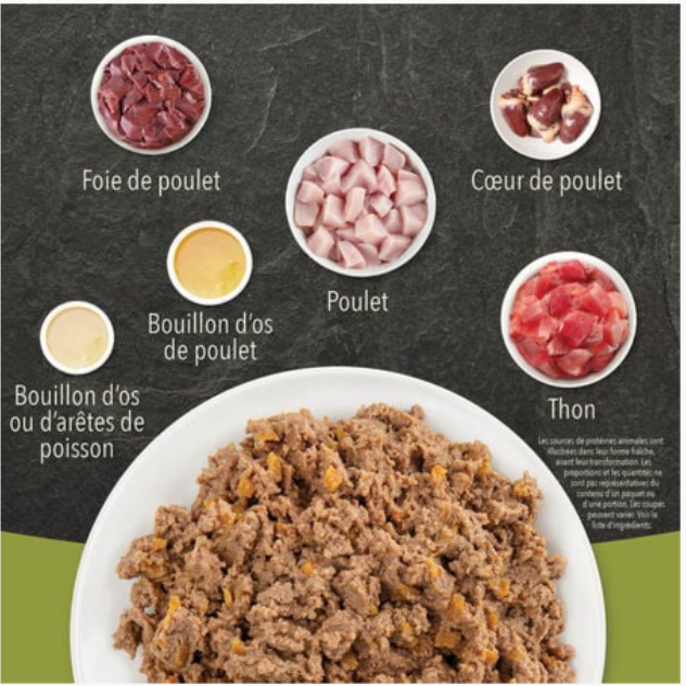 - Les 6 premiers ingrédients de cette recette sont du poulet, du thon, du bouillon d’os de poulet, du bouillon d’arêtes de poisson, du foie de poulet et du cœur de poulet crus.