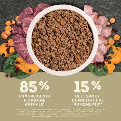 Elle contient 85 % d’ingrédients d’origine animale1 équilibrés avec 15 % de légumes, de fruits et de nutriments1,2. Et puisque nous faisons dans l’excès avec chaque ingrédient qui entre dans la composition des recettes ACANA, cette nourriture humide est faite de canard et de dinde riches en protéines, équilibrés avec des fruits et légumes visibles, comme des patates douces et des bleuets.