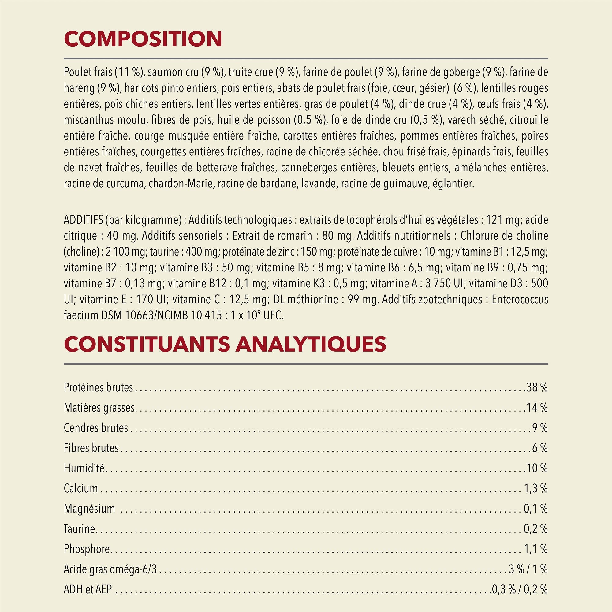 Poulet frais (11 %), saumon cru (9 %), truite crue (9 %), farine de poulet (9 %), farine de goberge (9 %), farine de hareng (9 %), haricots pinto entiers, pois entiers, abats de poulet frais (foie, cœur, gésier) (6 %), lentilles rouges entières, pois chiches entiers, lentilles vertes entières, gras de poulet (4 %), dinde crue (4 %), œufs frais (4 %), miscanthus moulu, fibres de pois, huile de poisson (0,5 %), foie de dinde cru (0,5 %), varech séché, citrouille entière fraîche, courge musquée entière fraîche, carottes entières fraîches, pommes entières fraîches, poires entières fraîches, courgettes entières fraîches, racine de chicorée séchée, chou frisé frais, épinards frais, feuilles de navet fraîches, feuilles de betterave fraîches, canneberges entières, bleuets entiers, amélanches entières, racine de curcuma, chardon-Marie, racine de bardane, lavande, racine de guimauve, églantier.