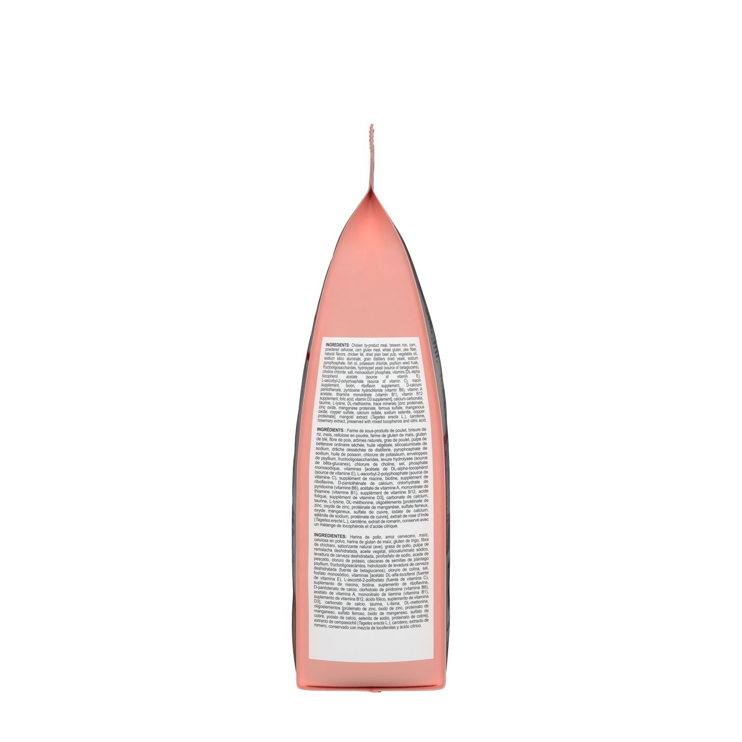 Chicken meal, broken rice, corn, wheat gluten, corn gluten meal, powdered cellulose, pea fibre, natural flavours, chicken fat, dried regular beet pulp, desiccated distillers grain, vegetable oil, silicoaluminate salt, fish oil, potassium chloride, salt, psyllium husk, sodium pyrophosphate, fructooligosaccharides, choline chloride, vitamins [DL-alpha-tocopherol acetate (source of vitamin E), L-ascorbyl-2-polyphosphate (source of vitamin C), niacin supplement, biotin, riboflavin supplement, calcium D-pantothenate, pyridoxine hydrochloride (vitamin B6), vitamin A acetate, thiamine mononitrate (vitamin B1), vitamin B12 supplement, acid folate, vitamin D3 supplement], hydrolyzed yeast, DL-methionine, taurine, trace elements [zinc proteinate, zinc oxide, ferrous sulfate, manganese proteinate, manganous oxide, copper sulfate, calcium iodate, sodium selenite, proteinate e], monosodium phosphate, marigold extract ( Tagetes erecta L.), rosemary extract, preserved with a mixture of tocopherols and citric acid.