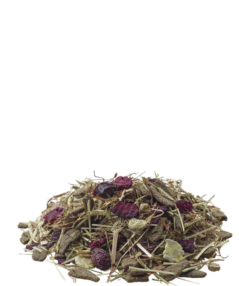 By-products of vegetable origin (28% grasses: timothy, cocksfoot, perennial ryegrass, meadowsweet bluegrass, meadow fescue, red fescue, white clover, red clover, meadow foxtail, ribwort plantain, dandelion , yarrow), vegetables (peas 12.5%, beetroot 5.5%, carrots 1.5%), fruits (rose hips 1%), seeds, vegetable protein extracts, minerals, FOS, calendula, MOS, algae , yucca