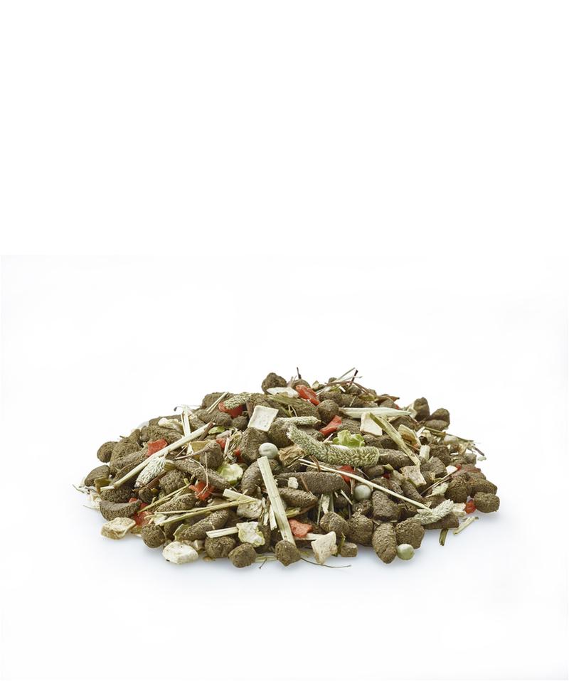 By-products of vegetable origin (timothée and herbs 22%), vegetables (green peas 14.2%, yellow peas 4%, parsnips 3.5%, leeks 3.5%), fruits, seeds, mineral substances, extracts vegetable proteins, oils and fats, FOS, calendula, MOS, algae, yucca